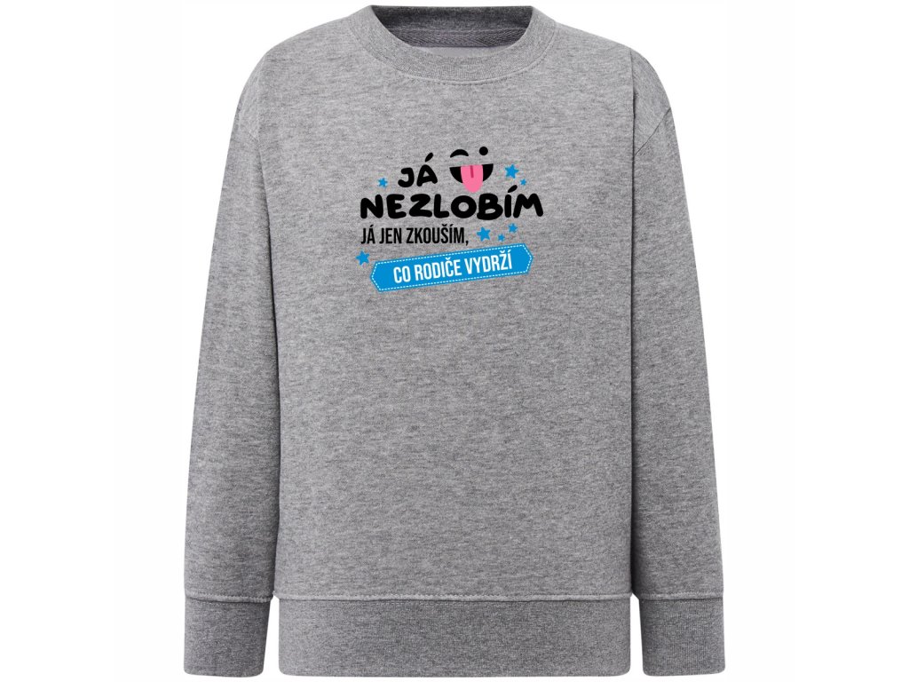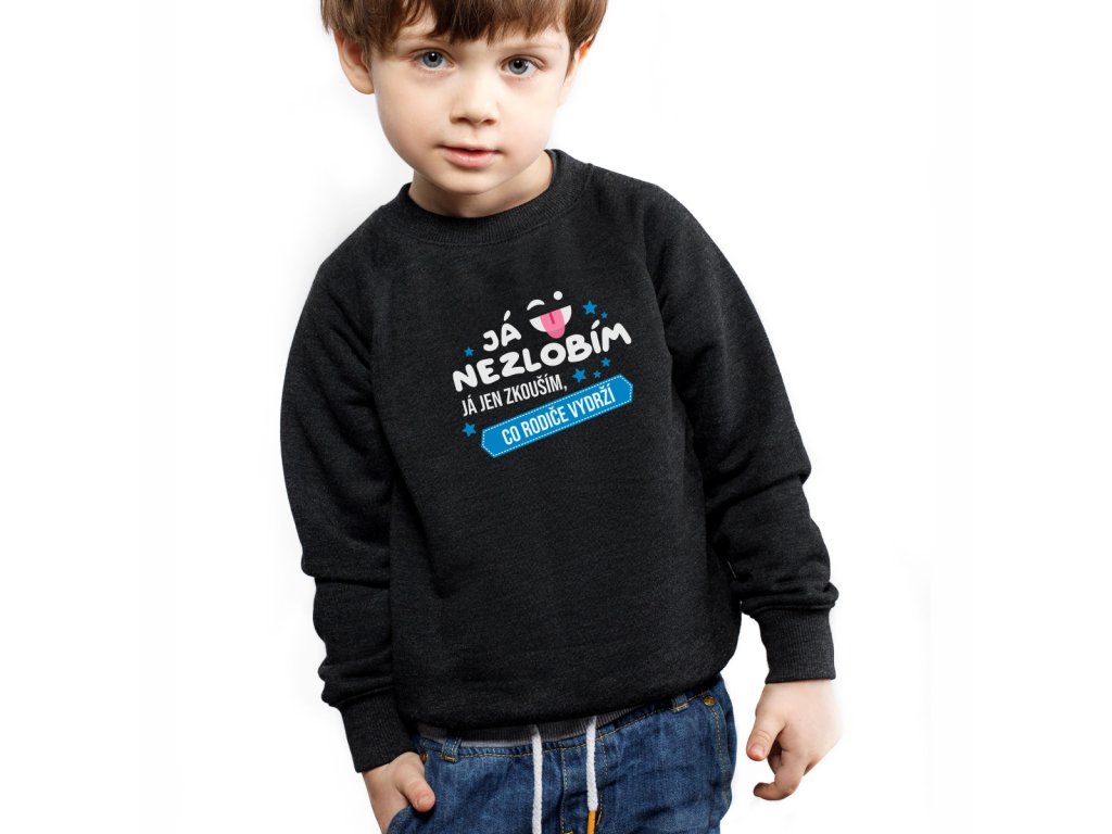 Dětská mikina s vtipným potiskem "já nezlobím, já jen zkouším co rodiče vydrží" jistě vystihne každé zlobidlo.