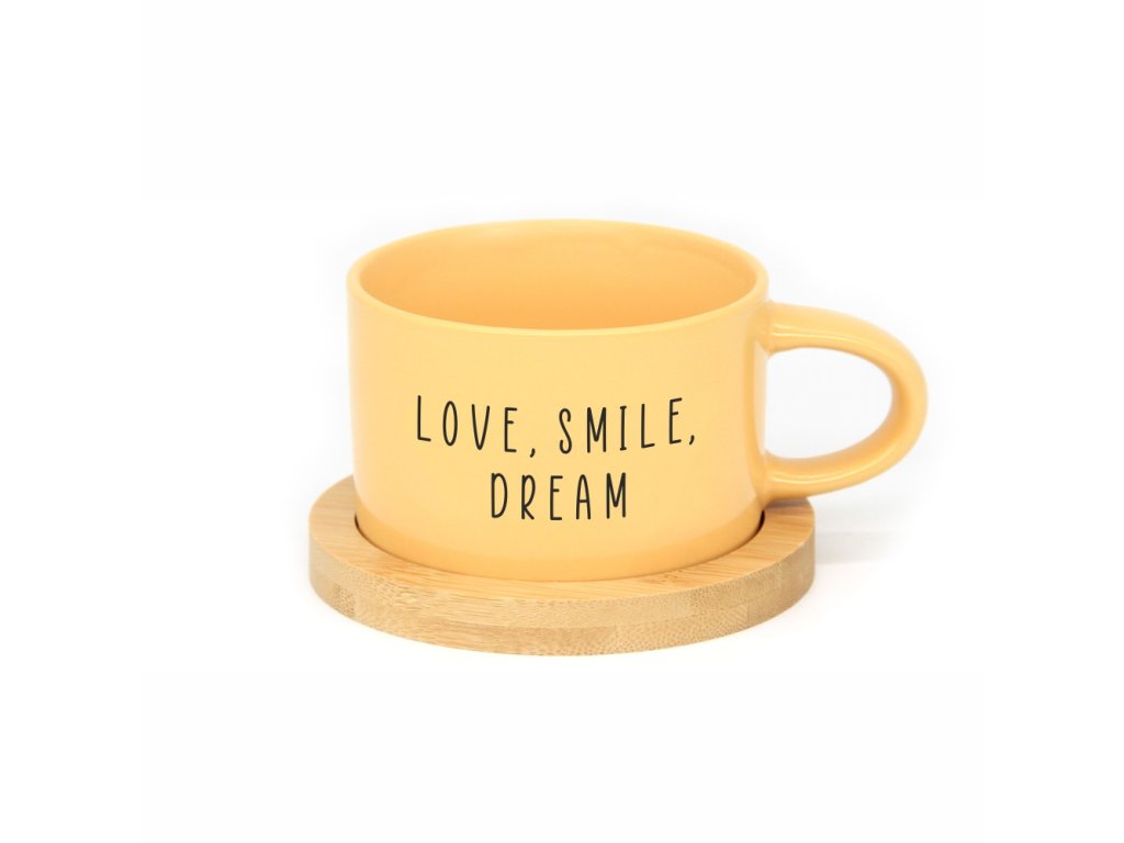 Barevný veselý makronkový hrneček s pozitivním potiskem - LOVE, SMILE, DREAM.